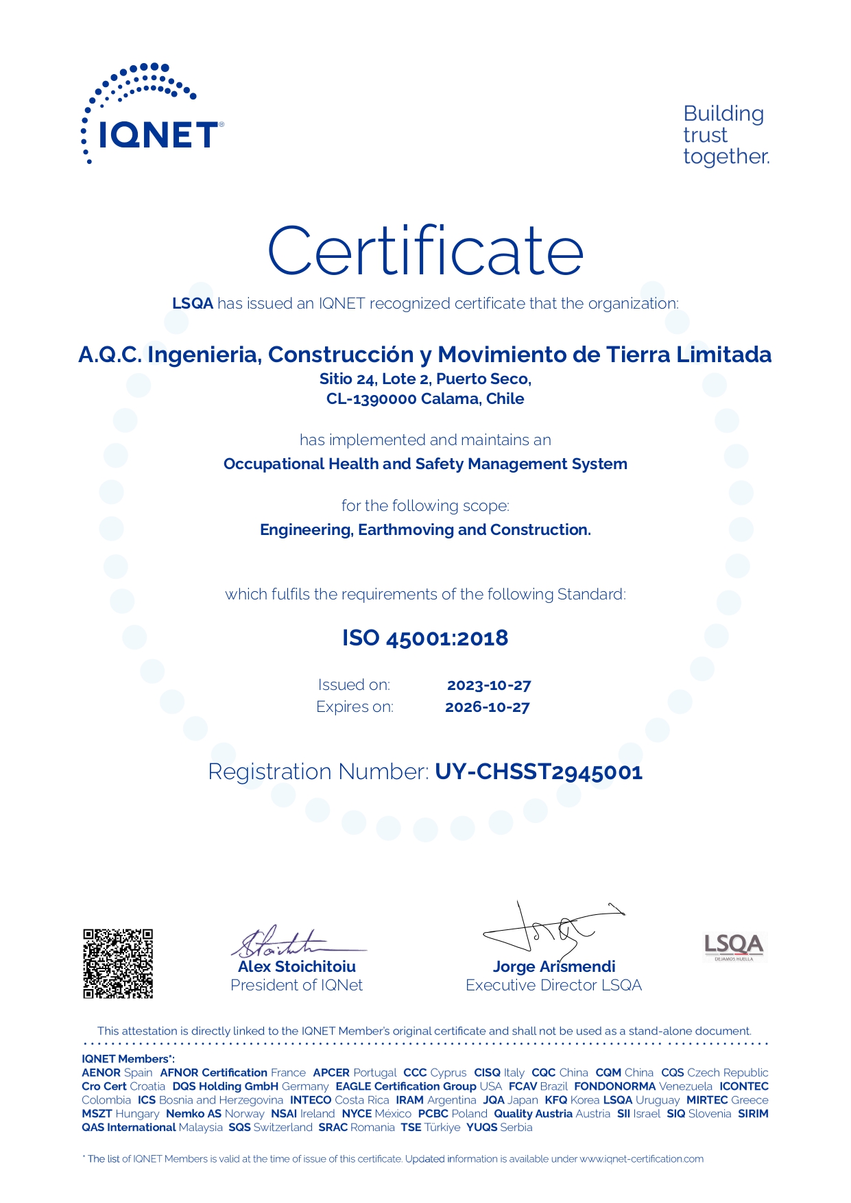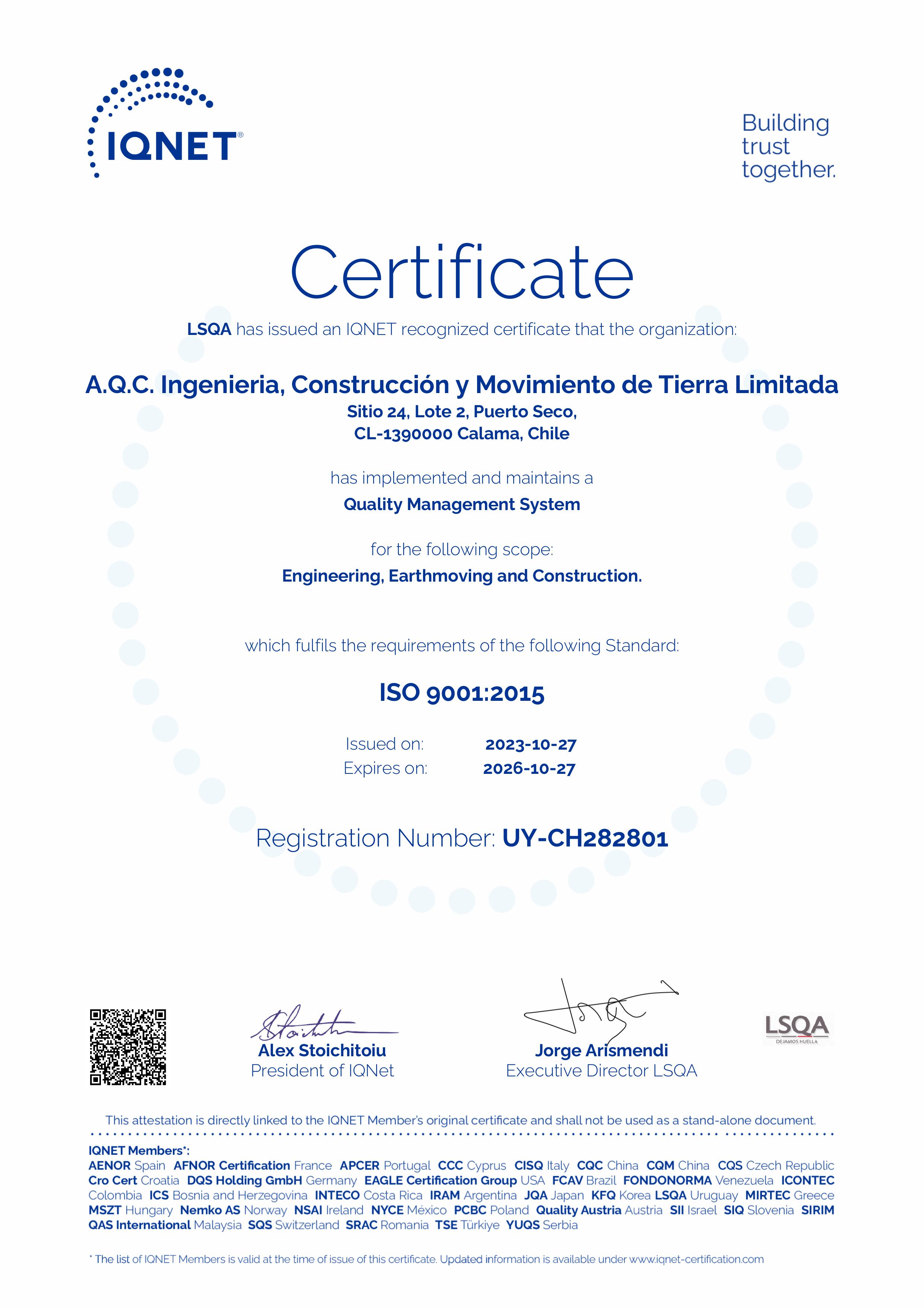 AQC opera bajo un Sistema de Gestión Integrado certificado según ISO 9001, ISO 14001 e ISO 45001: